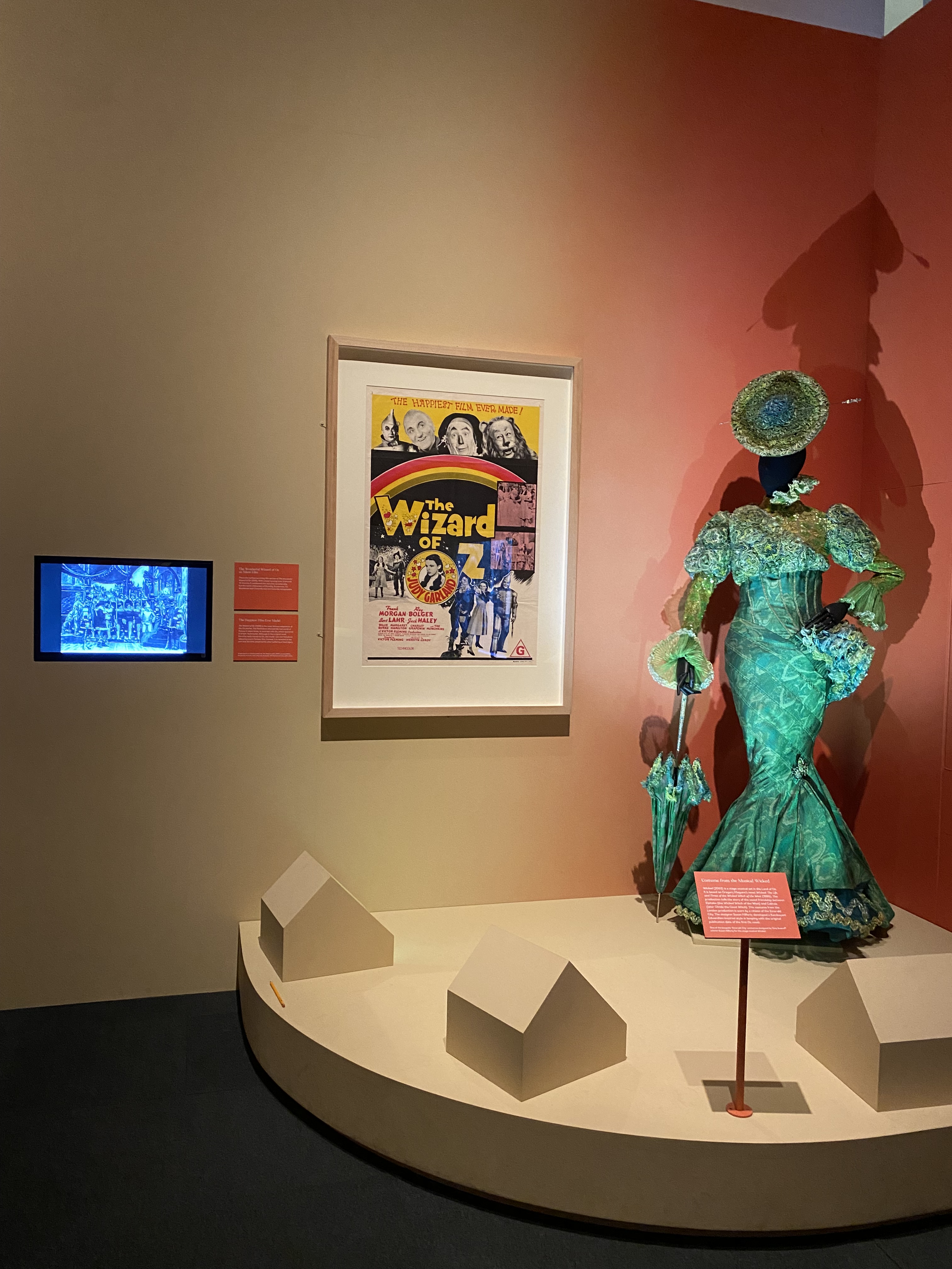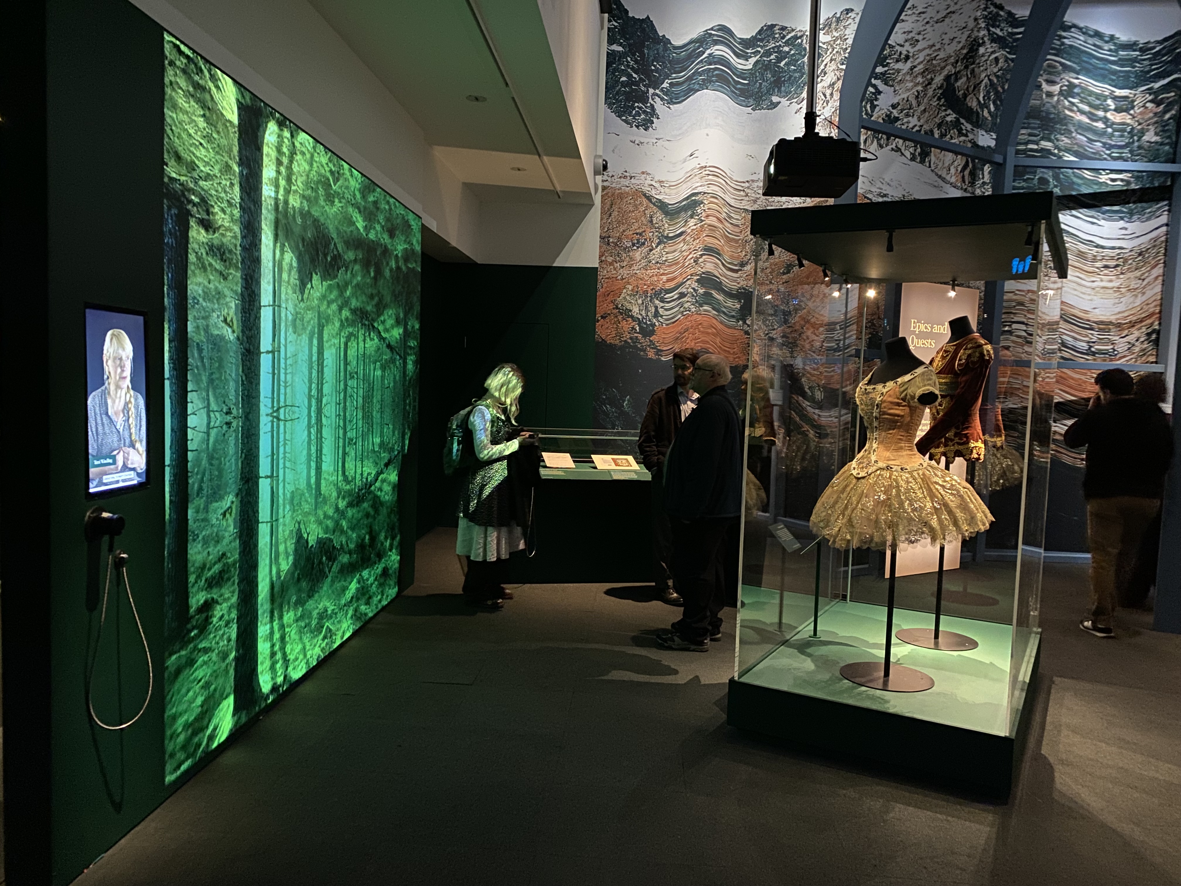 What would have been a large flat open area was divided by towering printed artwork and false walls to create a winding path that gave the audience a direction and order to consume the exhibition through. This created a gangway that artefacts were place and displayed along to discover as you walk through, rather than revealing everything immediately. The path is also divided into thematic sections by varying colours and imagery supporting the subcategory titles of Fairy and Folk Tales, Epics and Quests, Weird and Uncanny, and Portals and Worlds. The focus lighting enhances the readability of the artefacts and supporting text, while the lighting of the room is kept fairly dim to add to the mysterious and fantastical atmosphere.