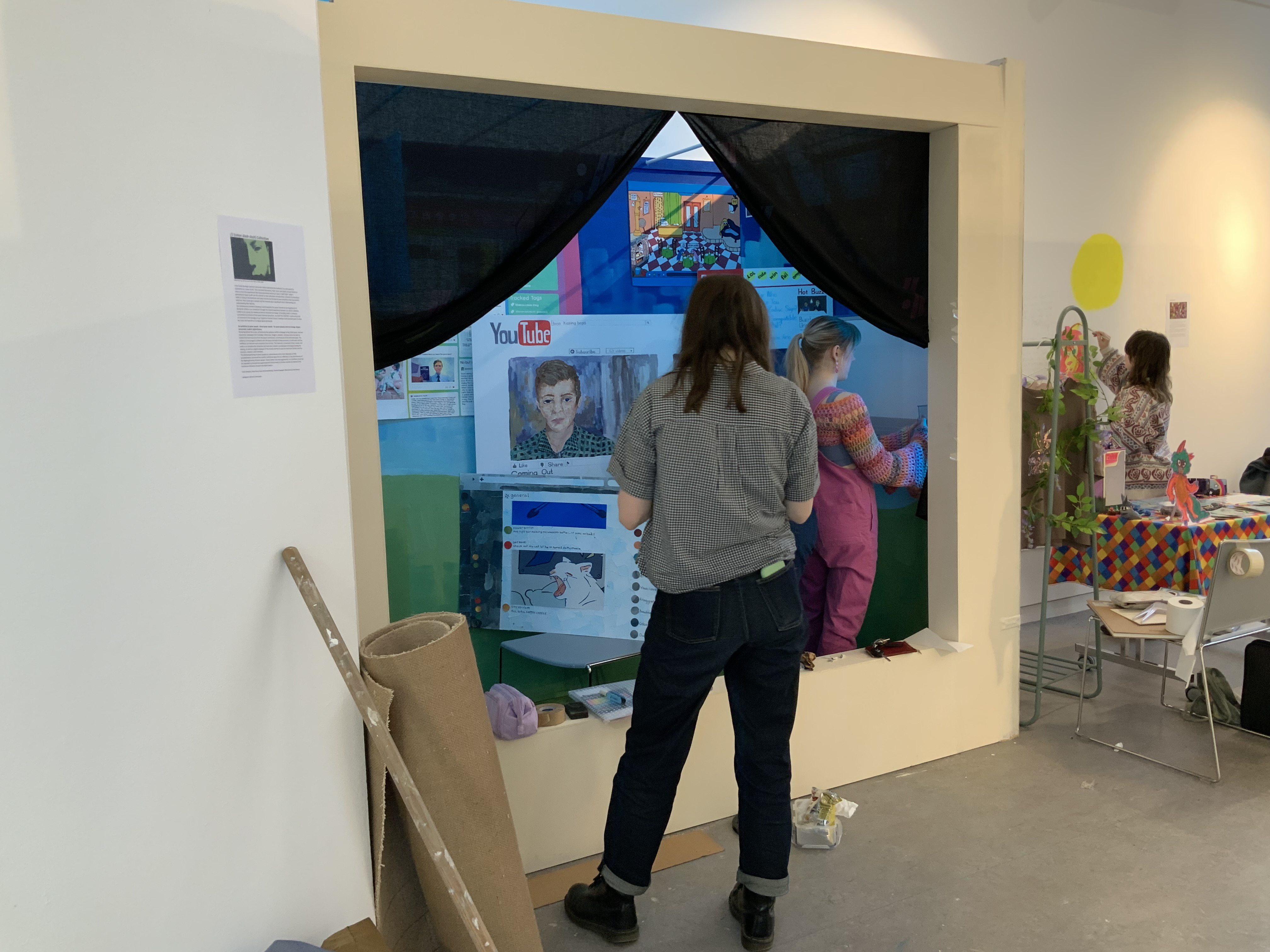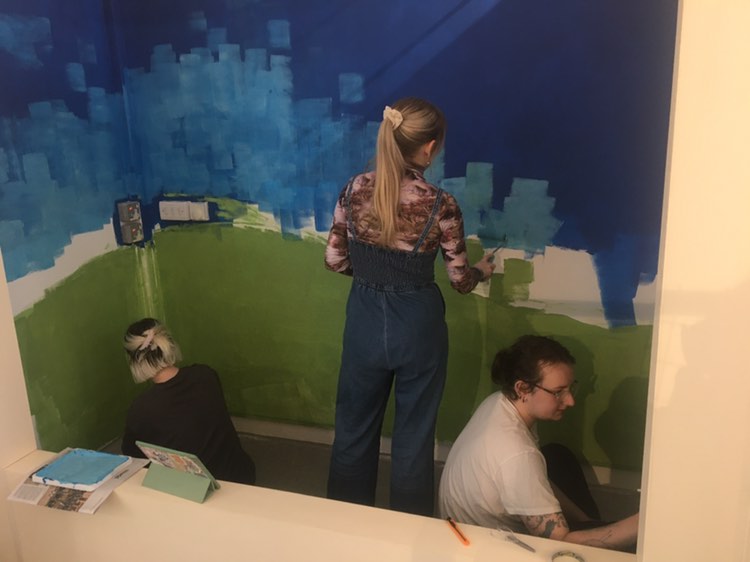 [Daisy and Damien painting the base colours for the mural and me creating the Windows hills artwork] [setting up the webpages in the final exhibition]