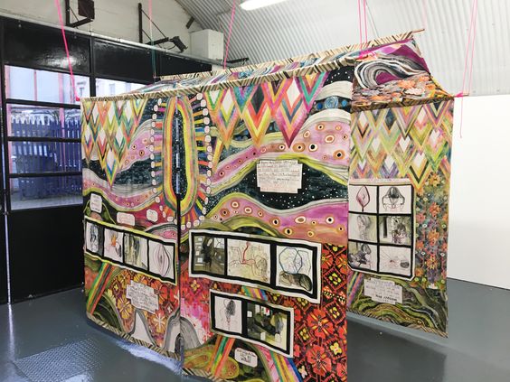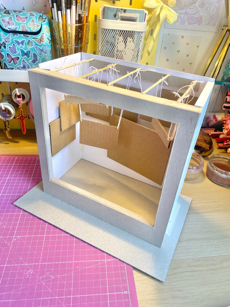 We considered various options for the fabrication of the exhibition’s other elements and talked to the SPCs about what we could book into. The keyboard materialisation ideas included using these sticky foam squares we found from the scrapstore as keys, creating a huge vinyl sticker of keyboard artwork to be stuck on the ground, and rug tufting our own rug (this was our favourite idea but we didn’t have access to or the expenses for the tools and materials). We continued with the rug concept as we felt it would link best to the bedroom inspiration for the exterior, I asked my dad if he had any spare pieces of carpet lying around his workshop and so we managed to get our hands on a free, big piece of cream carpet that Daisy was able to carve the keyboard shapes into. The curtains were another aspect that changed a lot through our designing and making process. The curtains were going to hang entirely along the interior walls, with the slight opening in the front for people to climb past the screen into, and the Windows hills desktop background mural would be painted onto them.