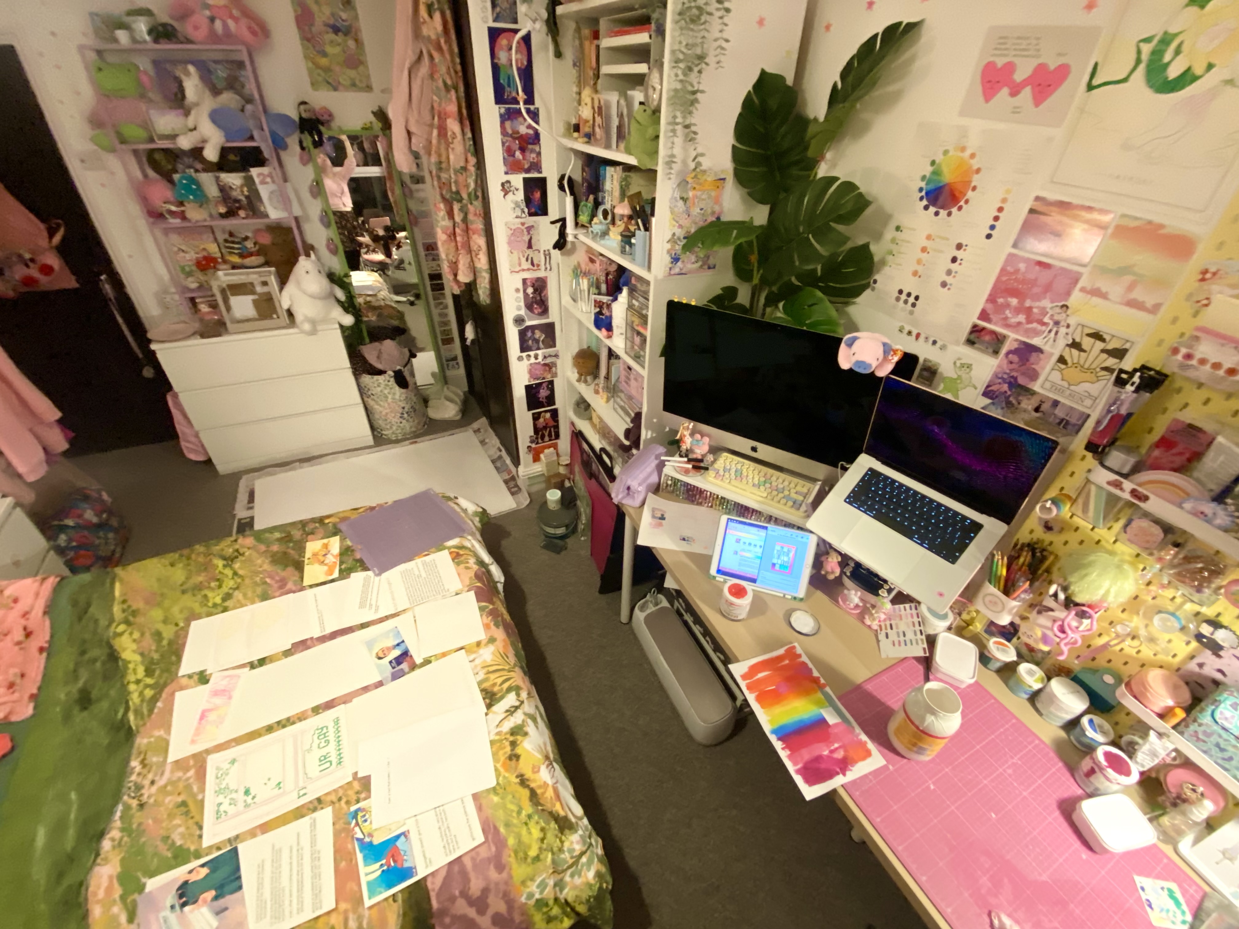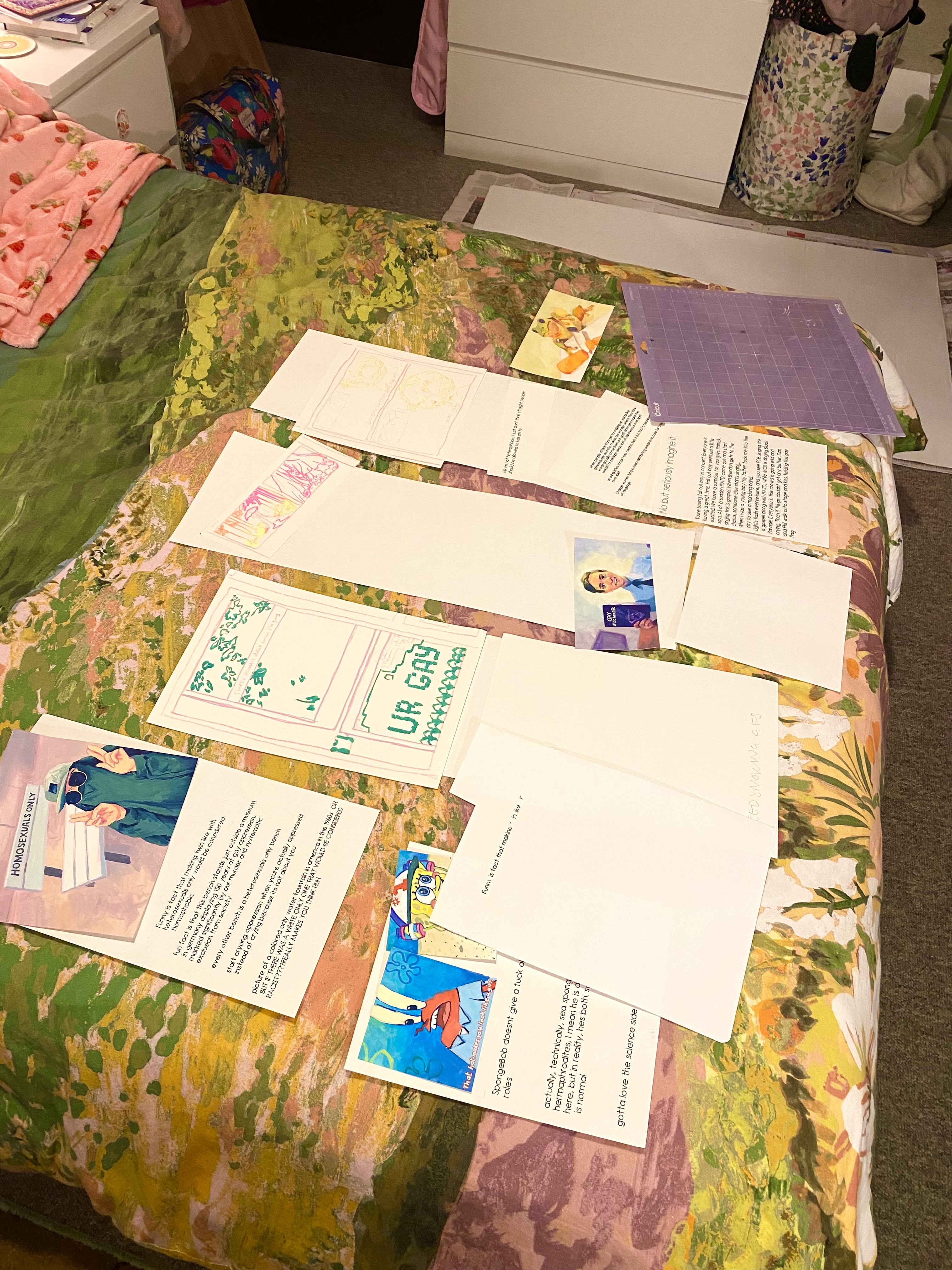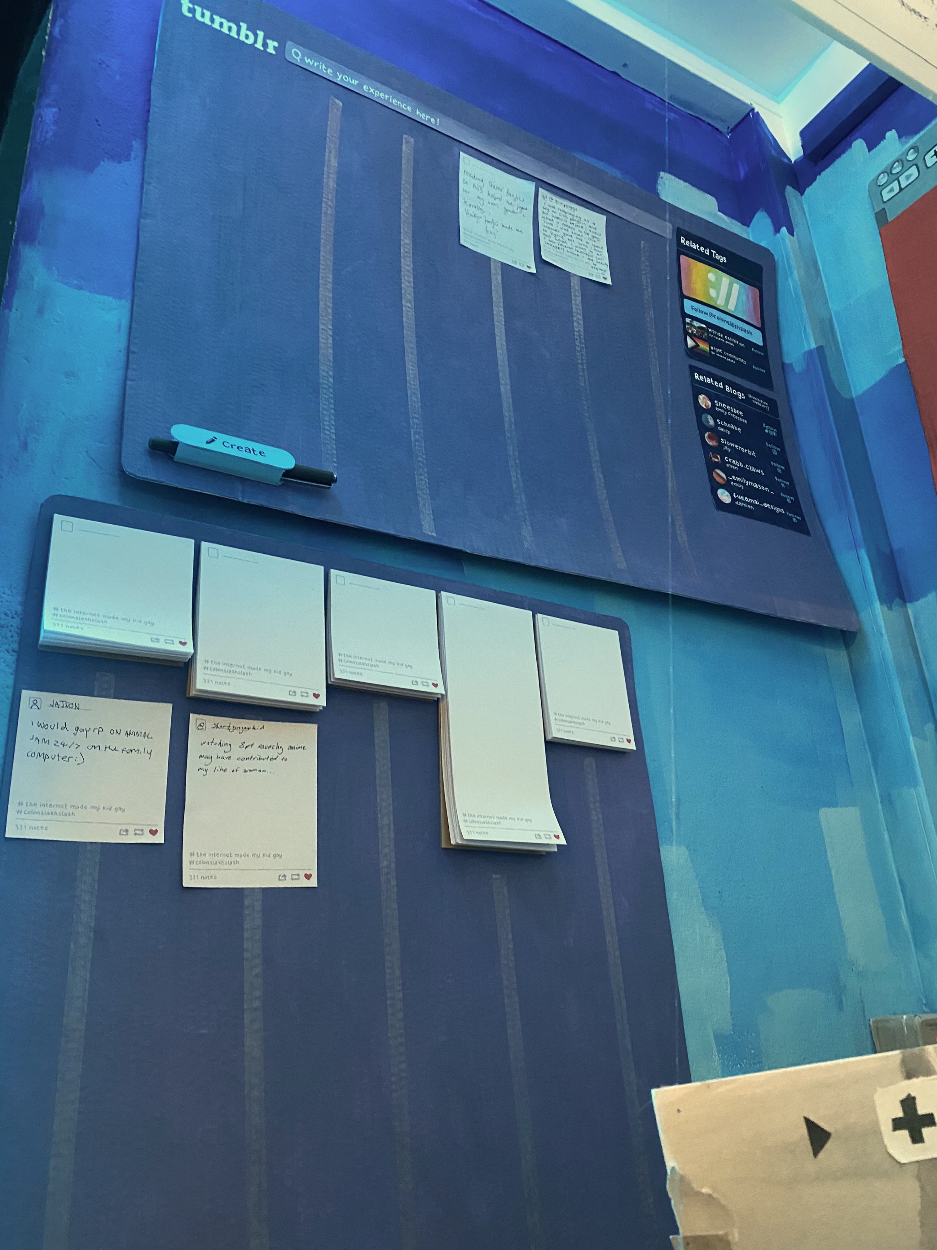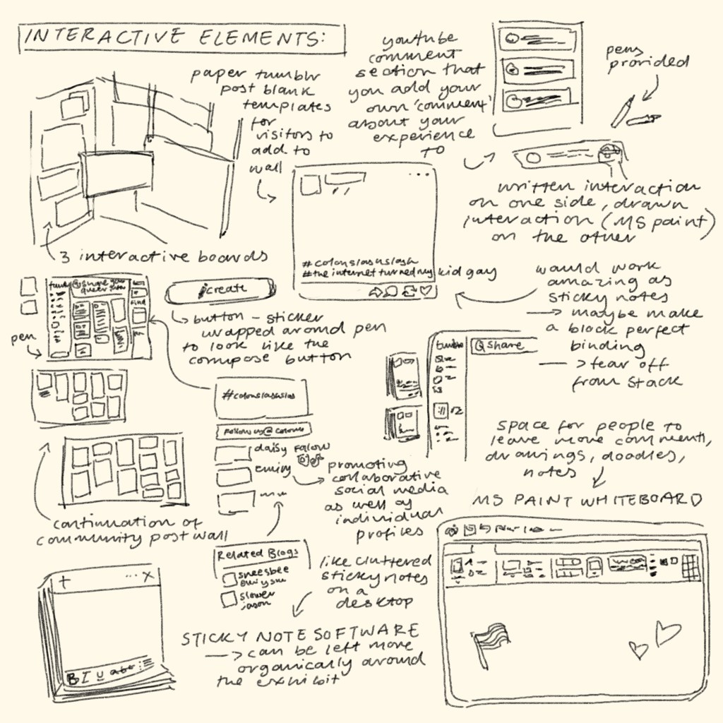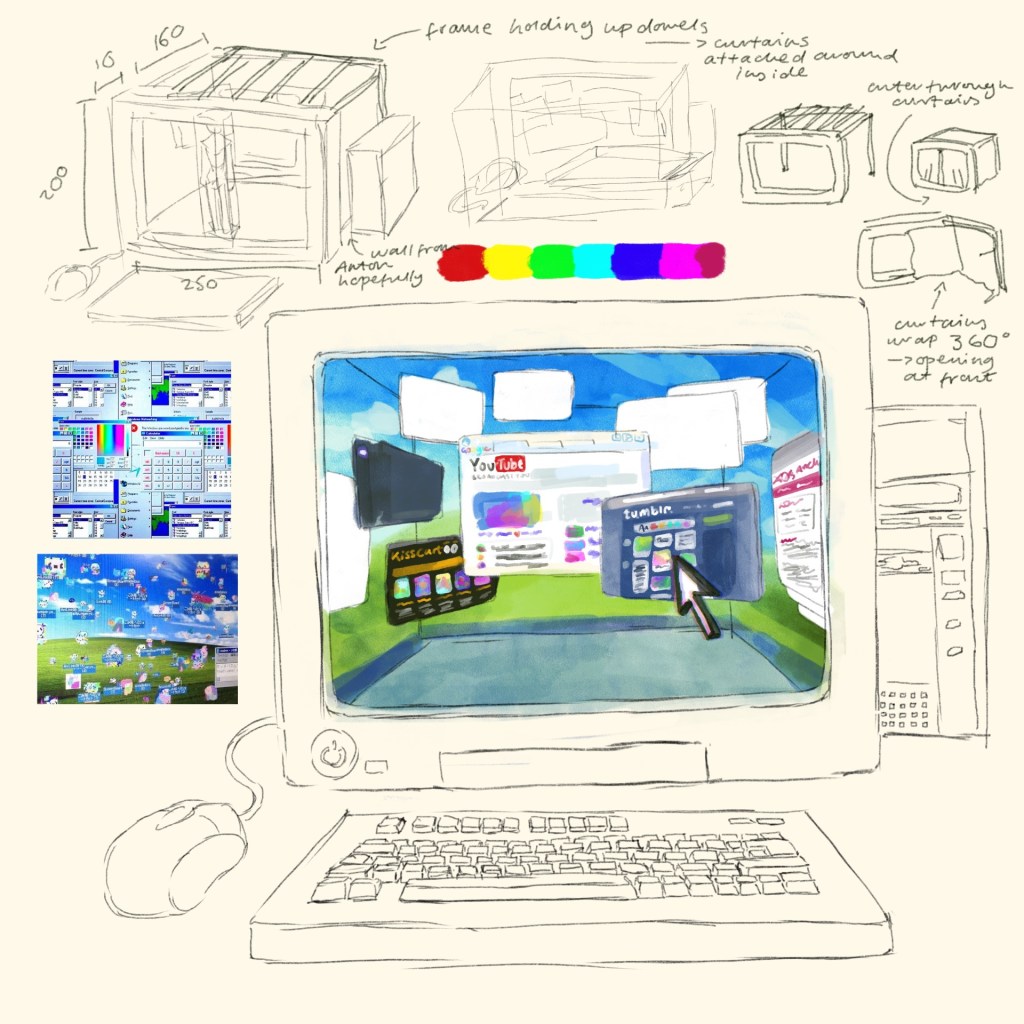 Most of our brainstorming was done through verbal group discussions. Upon deciding on our collective’s theme of ‘2010s queer internet’, we ideated how we could transform this time period of digital space into a physical setting that an audience could interact with. Initially expanding our ideas beyond possibilities before bringing them back to realistic logistics later on. Creating a huge laptop where you could walk on the keyboard and pass through the screen ‘into the internet’; having a bean bag/seat computer mouse to further create a bedroom space outside of the computer, corresponding to our artefact’s theming; creating ‘corners of the internet’, as digital niches (websites, fandoms, communities) are often called, by having different stands for these corners in a physical space; a queer teenagers bedroom but almost in a digital reality, bedroom inside the internet.