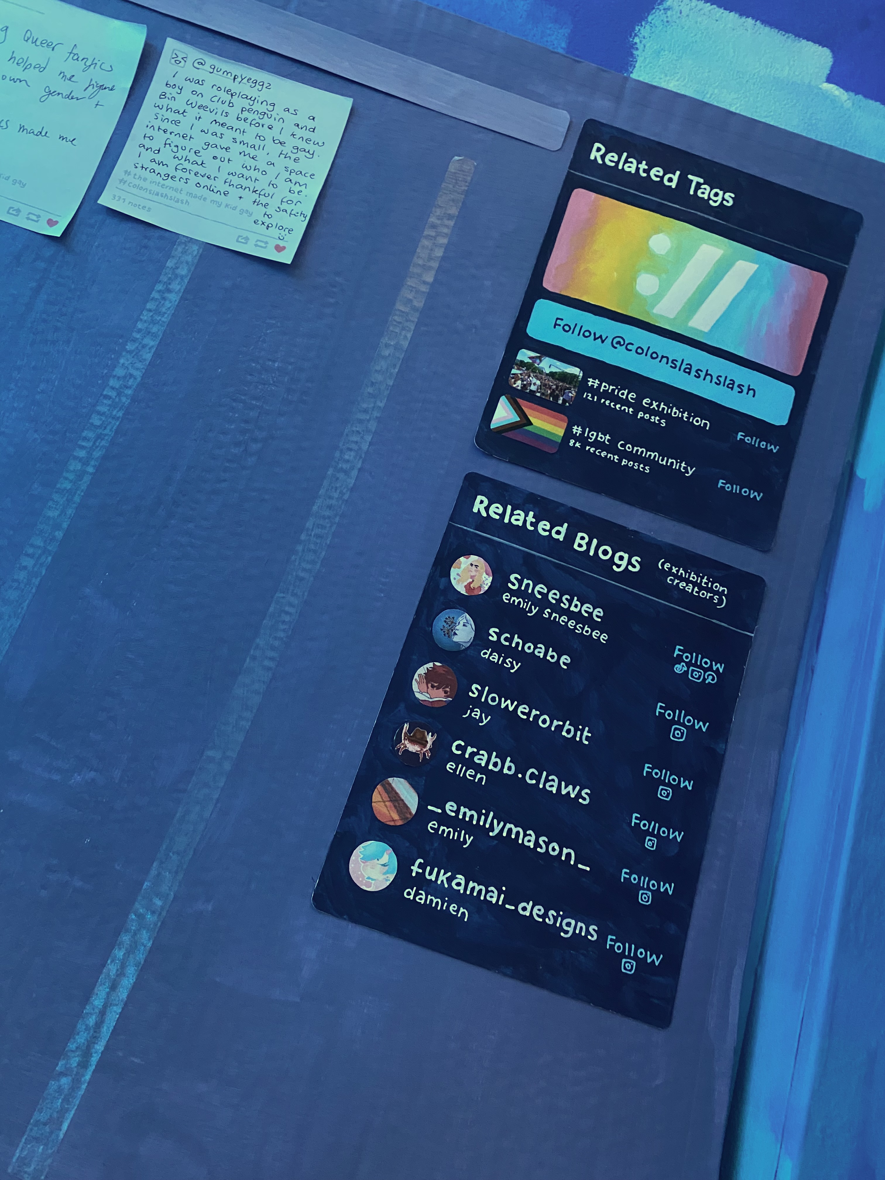 We had a lot of back and forth when it came to the materials of the webpages, we weren’t able to find one material that would both come in large enough sizes whilst also being in budget. However, I actually like that we all ended up using different materials that all had their own quirks as I think it fits the visual concept of a patched together internet made by regular people with rudimentary materials. Rather than something shiny, perfect and corporate, as that doesn’t reflect how these internet communities we originally created. They were largely homemade by a worldwide collaborative of queer people, and I like that our exhibition encompasses that on a smaller scale.