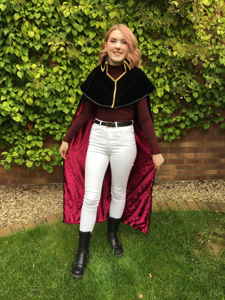 the cape for this outfit was the first time i made a piece of clothing for a cosplay. i made it from cutting up an old velvet halloween cloak and other materials from my collection. the rest of the outfit was comprised of things i already owned, so i didn’t have to spend anything on this cosplay! (i forgot to put my gloves on for the photo whoops)