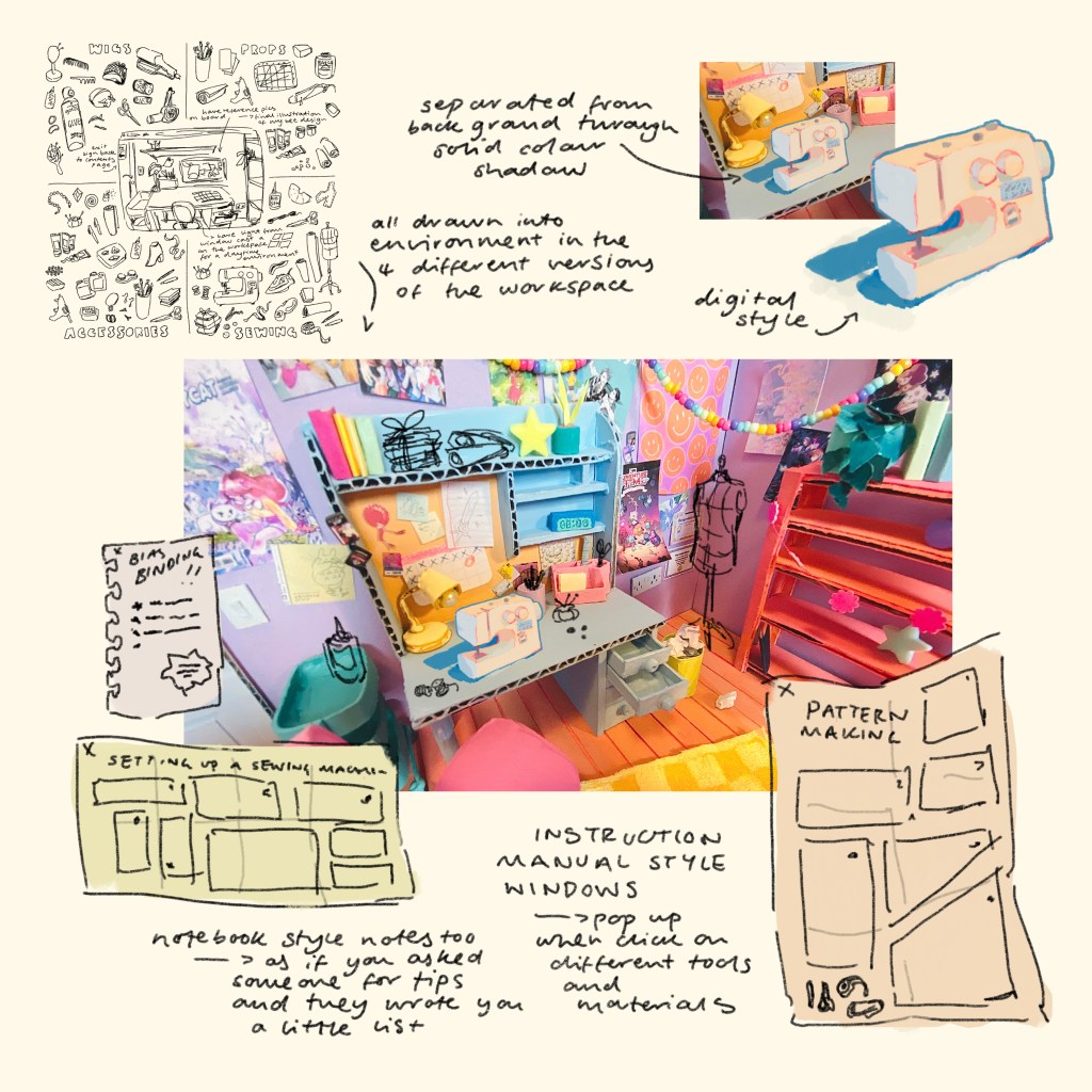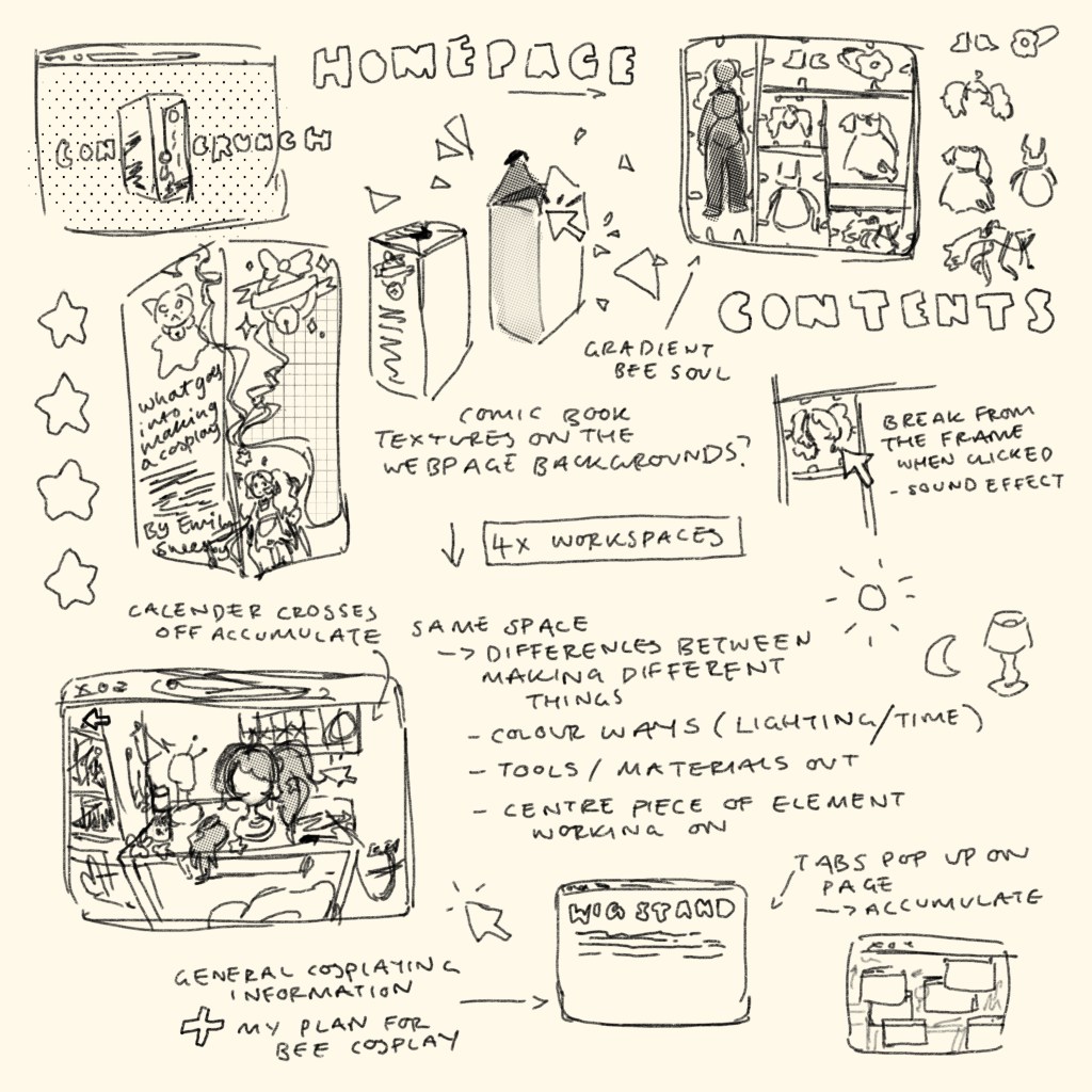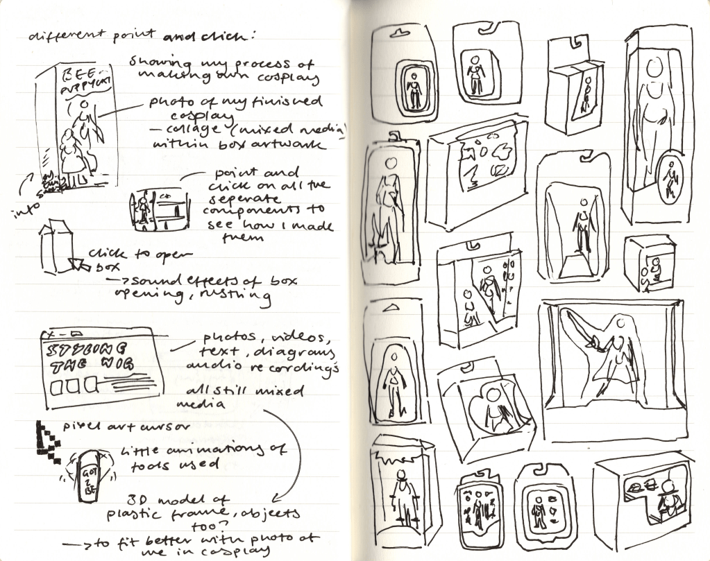 My essay is going to be about everything that goes into making complex and impressive cosplays; the amount of skill, dedication and work that it takes to create just one costume. Creating an informational hub for cosplay guidance and techniques, to work to keep the craftsmanship in the cosplay community alive. The presentation of my findings will be alongside the journey of me trying to make my first fully handmade cosplay so I can gather first-hand experience on the whole process of designing and making, visualised in the concept for a point-and-click navigation website. You click on the different components of the cosplay (wig, dress, props) and it takes you to the workspace filled with all the tools and materials used to create that component. There would be different elements to click on throughout the scene that bring up windows with different instructional comics on methods used to make cosplays (using my Bee design as the main visual vehicle as well as elements from other characters). Bee from the surrealist cartoon Bee and Puppycat 2013 pictured above.