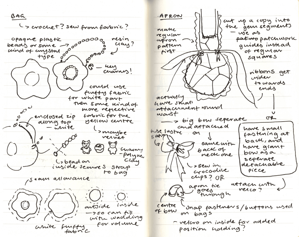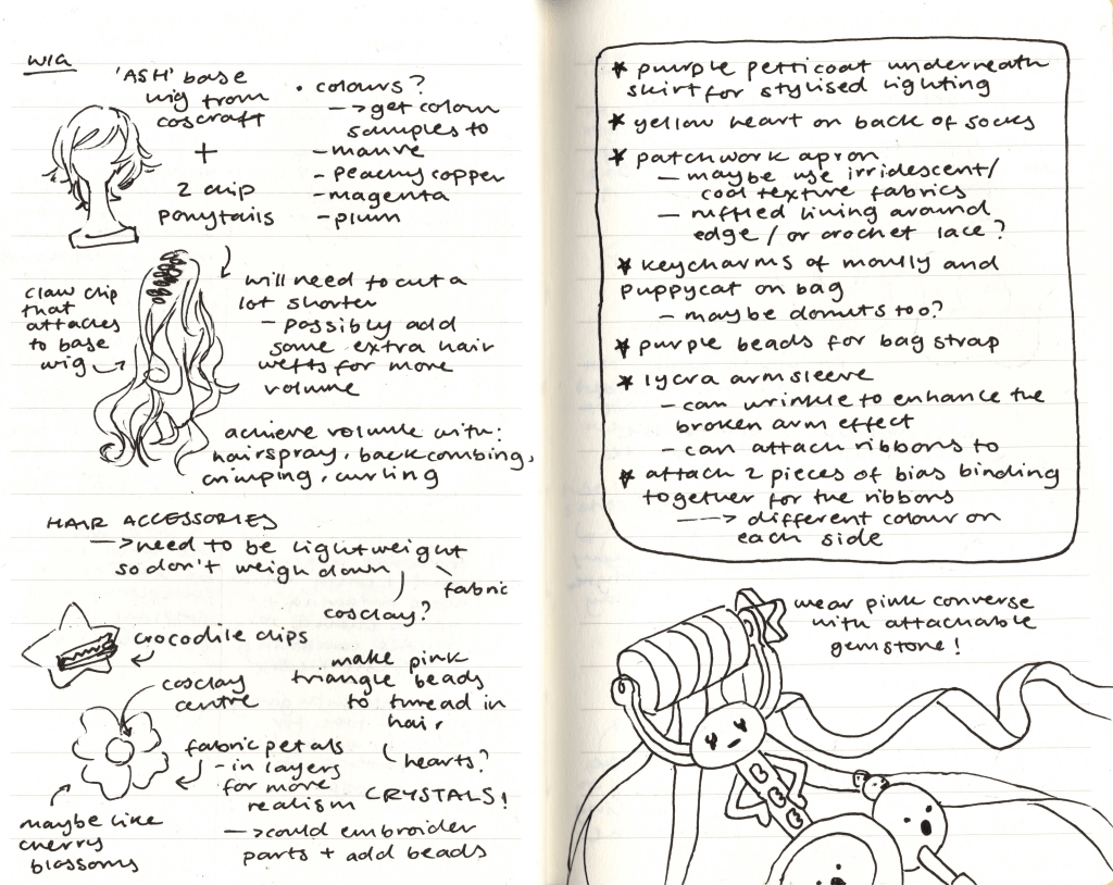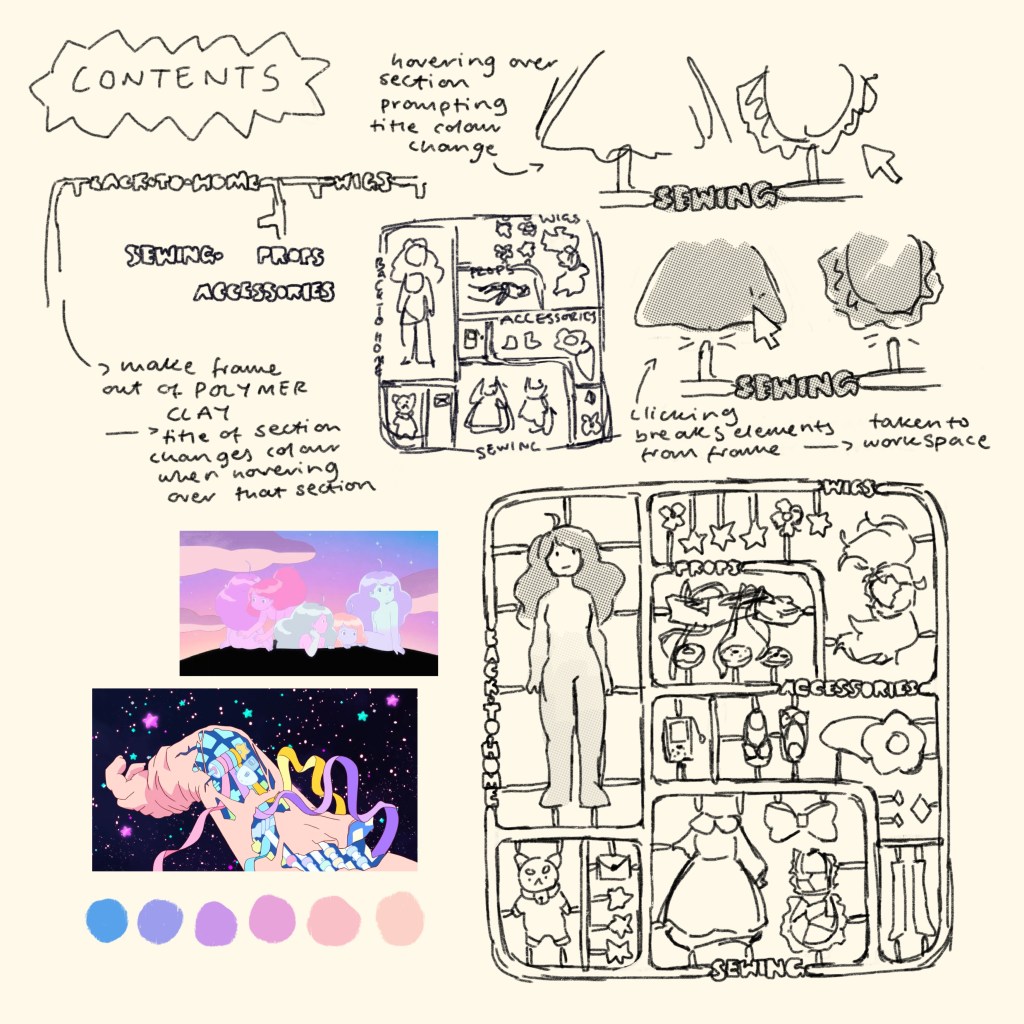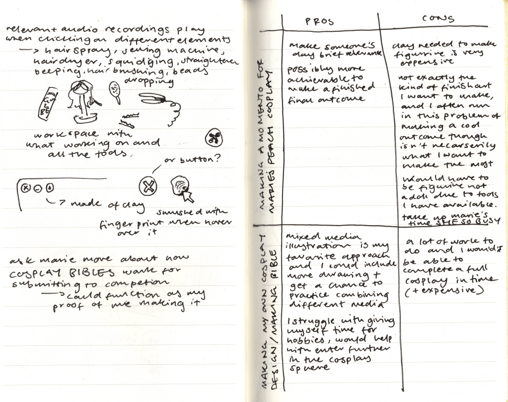 My essay is going to be about everything that goes into making complex and impressive cosplays; the amount of skill, dedication and work that it takes to create just one costume. Creating an informational hub for cosplay guidance and techniques, to work to keep the craftsmanship in the cosplay community alive. The presentation of my findings will be alongside the journey of me trying to make my first fully handmade cosplay so I can gather first-hand experience on the whole process of designing and making, visualised in the concept for a point-and-click navigation website. You click on the different components of the cosplay (wig, dress, props) and it takes you to the workspace filled with all the tools and materials used to create that component. There would be different elements to click on throughout the scene that bring up windows with different instructional comics on methods used to make cosplays (using my Bee design as the main visual vehicle as well as elements from other characters). Bee from the surrealist cartoon Bee and Puppycat 2013 pictured above.