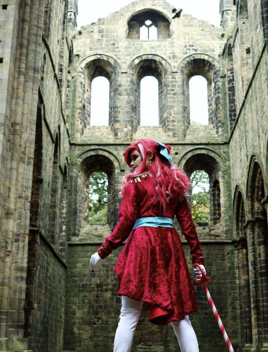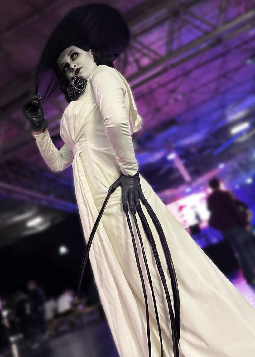 but in terms of character, i’ve gotta say my lady dimitrescu cosplay is my favourite and also tends to be a lot of other people’s favourite. it’s mostly my favourite just because i made it during my alevels when resident evil village came out. and ever since then i’ve been constantly evolving that cosplay. i must have remade the entire dress, i remade all the accessories, restyled the wig. and it’s the first cosplay i got to meet a famous person in! i got to meet lady dimitrescu’s voice actor, maggie robertson, in it and so it holds that special memory for me.